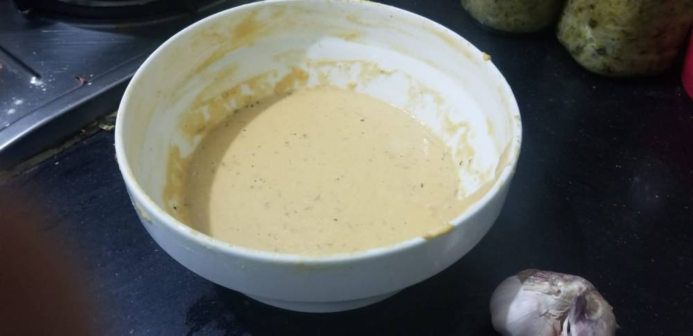 - Mix it with besan with a fork, adding enough water till it is all incorporated.
